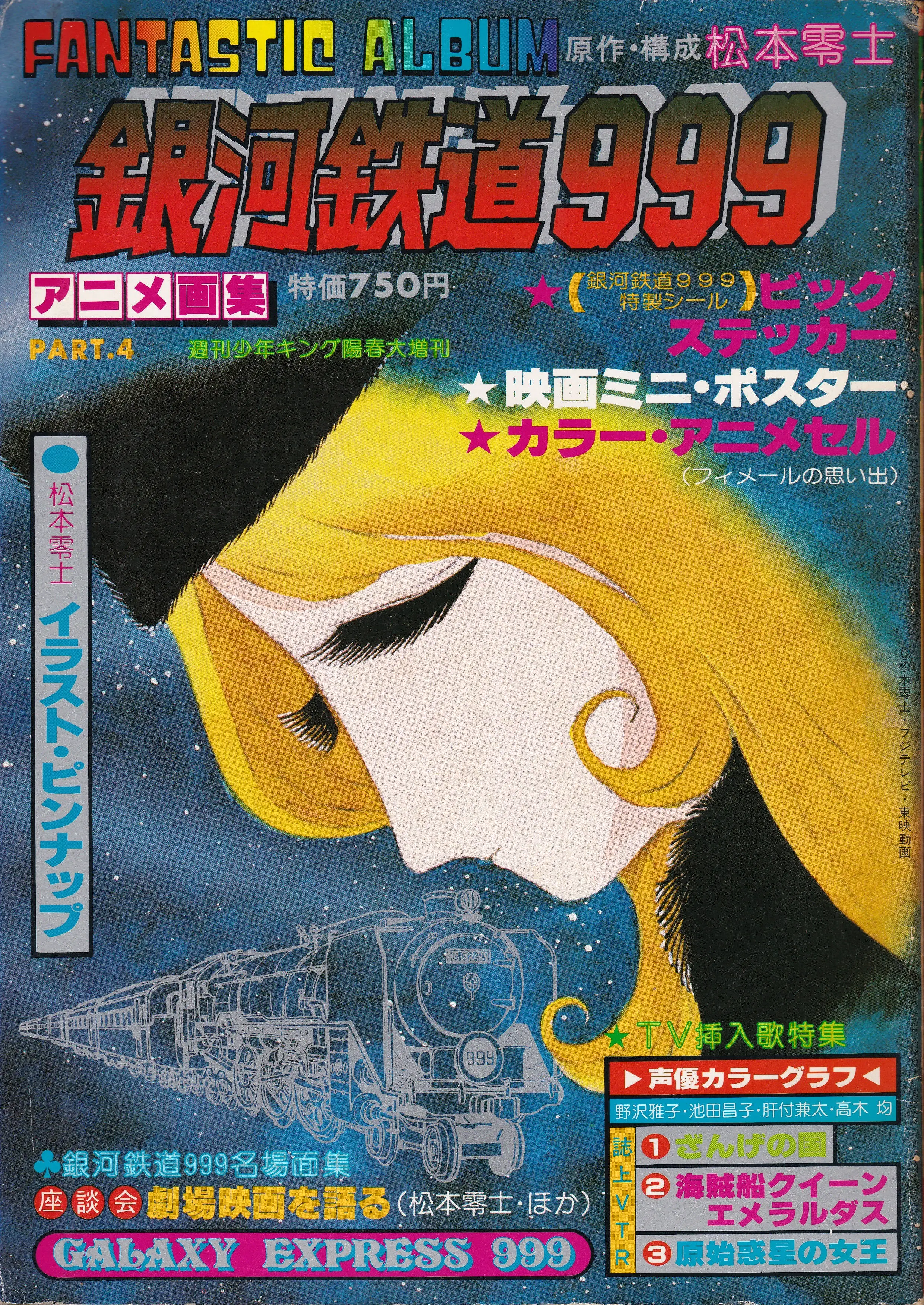 | 収録 | 銀河鉄道999BIGステッカー 映画ミニ・ポスター 松本零士イラスト・ピンナップ カラーアニメセル フィメールの思い出 銀河鉄道999ダイジェスト 誌上VTR①ざんげの国 インフォメーション ・ストーリー紹介 ・トピックス ・放映局・放送日一覧表 ・スタップ一覧 ・劇場映画設定資料 挿入歌特集 インタビュー 渡辺直子「私、自然に囲まれているのが好きなんです」 名場面集 ・白骨の歌 ・サケザン大陸 ・霧の葬送惑星 ・鋼鉄天使 ・プレーテッドシティの魔女 ・霧の都のカスミ ・球状住宅団の大酋長 ・ワルキューレの空間騎行 エッセイ ・はいけい松本零士さま。-----永島慎二 ・”銀河鉄道に乗りたい”------藤子不二雄 ・面をあげてやさしくりりしく---石子順 ・銀河鉄道999と視聴率 ------別所孝治 ・「銀河鉄道999」は翔び続ける --横山賢二 小湊洋市 クローズアップ 池田昌子 誌上VTR②海賊船クイーンエメラルダス 銀河鉄道999コレクション 声優カラーグラフ 野沢雅子/池田昌子/肝付兼太/高木均 愛読者プレゼント 座談会 銀河鉄道999劇場映画を語る 松本零士/高見義雄/りん・たろう/小松原一男/椋尾篁/司会=金春智子 ゲスト声優紹介 誌上VTR③原始惑星の女王 |