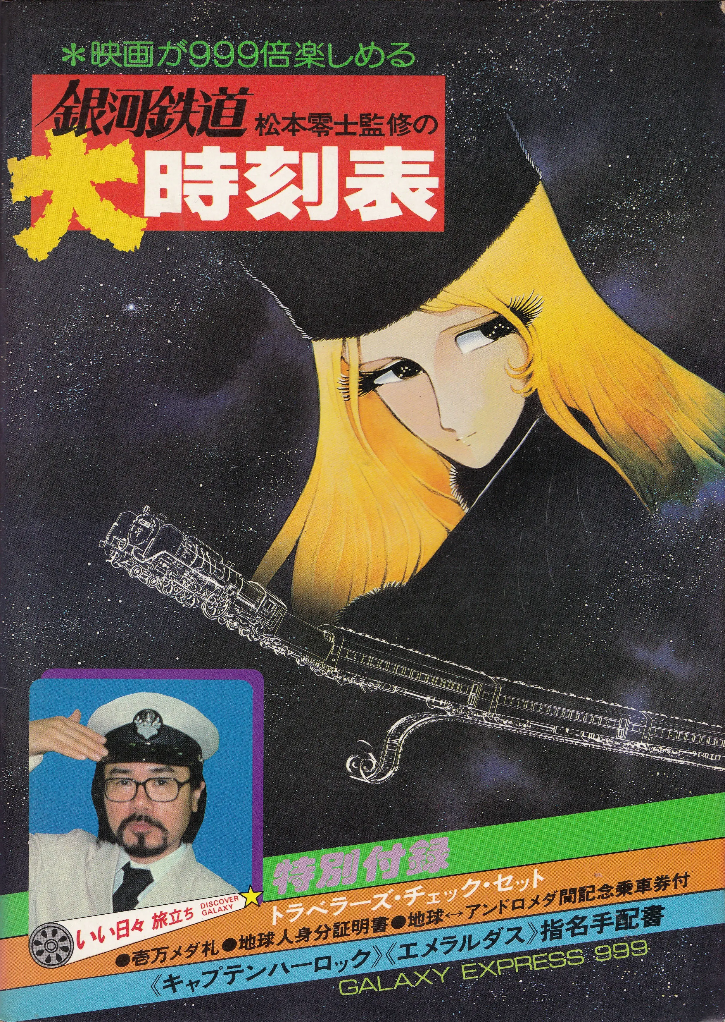 | 収録 | 大宇宙図 ステーション 操縦機関室 銀河鉄道列車図鑑 宇宙列車情報 宇宙旅行入門 ブループリント 時刻表 ・大銀河本線 下り(地球--バカタレ) ・大銀河本線 下り(怒髪帝国--アンドロメダ) ・大銀河本線 上り(アンドロメダ--怒髪帝国) ・大銀河本線 上り(バカタレ--地球) ・ローカル線 ・銀河中央線 下り ・大オリオン線 下り ・カペラ高速線 下り ・内銀河中央線 下り ・オリオン大環状線 外回り ・マゼラン連絡線 下り ・謎の外銀河線 下り ・アルデバラン環状線 内回り 映画 銀河鉄道999 ハイライト・シーン 列車編成 営業案内 食堂車案内 特別付録 ・トラベラーズ・チェック・セット ・地球・アンドロメダ間開通記念乗車券 ・地球人身分証明証 ・壱万メダ札 ・指名手配書 ・宇宙海賊 キャプテン ハーロック ・女海賊 エメラルダス 沿線案内 銀河鉄道路線図 |