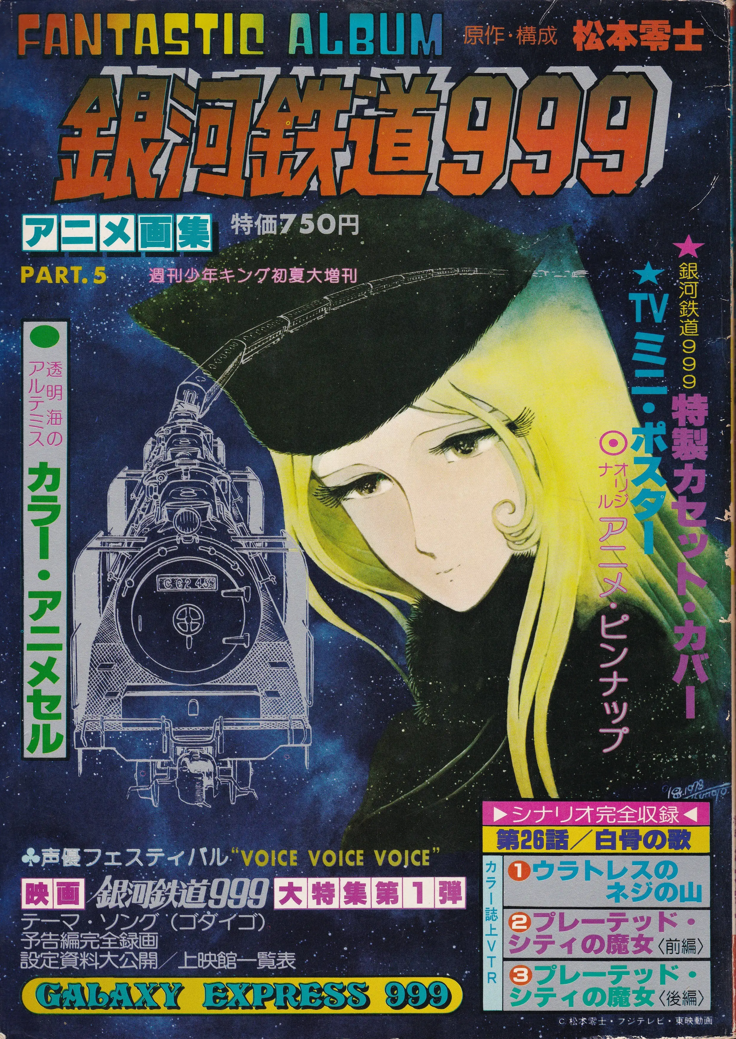 | 収録 | 特製カセット・カバー オリジナル アニメ・ピンナップ テレビ・ミニポスター カラーアニメセル 透明海のアルテミス 銀河鉄道999ダイジェスト 新オープニング 誌上VTR①ウラトレスのネジ山 インフォメーション ・ストーリー紹介 ・放送局・放映日一覧表 ・設定資料集 ・放映一覧 ・予告ナレーション特集 ・スタッフ一覧表 誌上VTR②プレーテッドシティの魔女(前編) イメージ銀河鉄道999 ドキュメント プロデューサー24時 銀河鉄道999制作プロセス 銀河鉄道999コレクション シナリオ完全収録 白骨の歌 クローズアップ 肝付兼太 声優 もう一つの顔 スタッフ名鑑 誌上VTR③プレーテッド・シティの魔女(後編) 銀河鉄道999制作発表記者会見誌上再録 マンガに対する情熱を賭ける 特集! 銀河鉄道ロマンの旅 銀河鉄道999テーマソング 設定資料集 松本零士先生 全国キャンペーン一覧表 上映館一覧表 誌上初! 銀河鉄道999予告編 誌上完全収録 愛読者プレゼント |