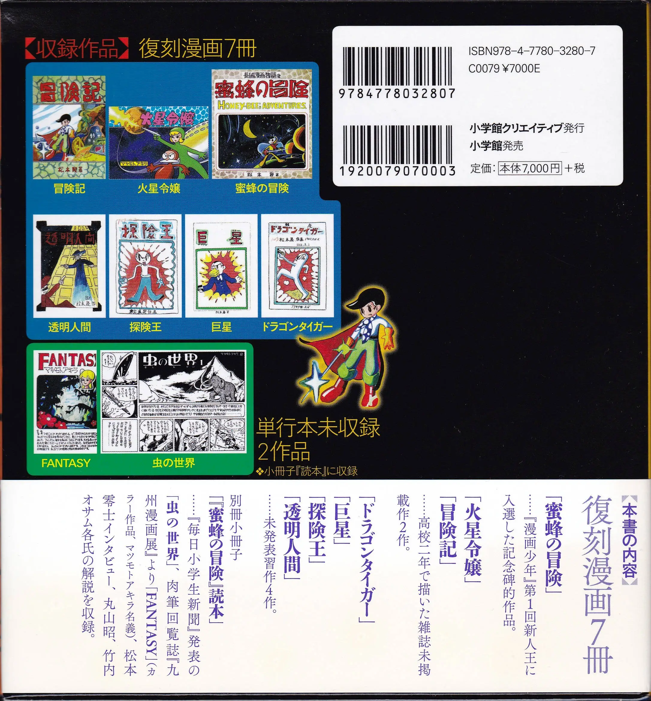 | 収録 | 「蜜蜂の冒険」(『漫画少年』第1回新人王入選作品) 「火星令嬢」「冒険記」(高校時代の雑誌未掲載作品) 「ドラゴンタイガー」「巨星」「探検王」「透明人間」(未発表習作) 「『蜜蜂の冒険』読本」 |
