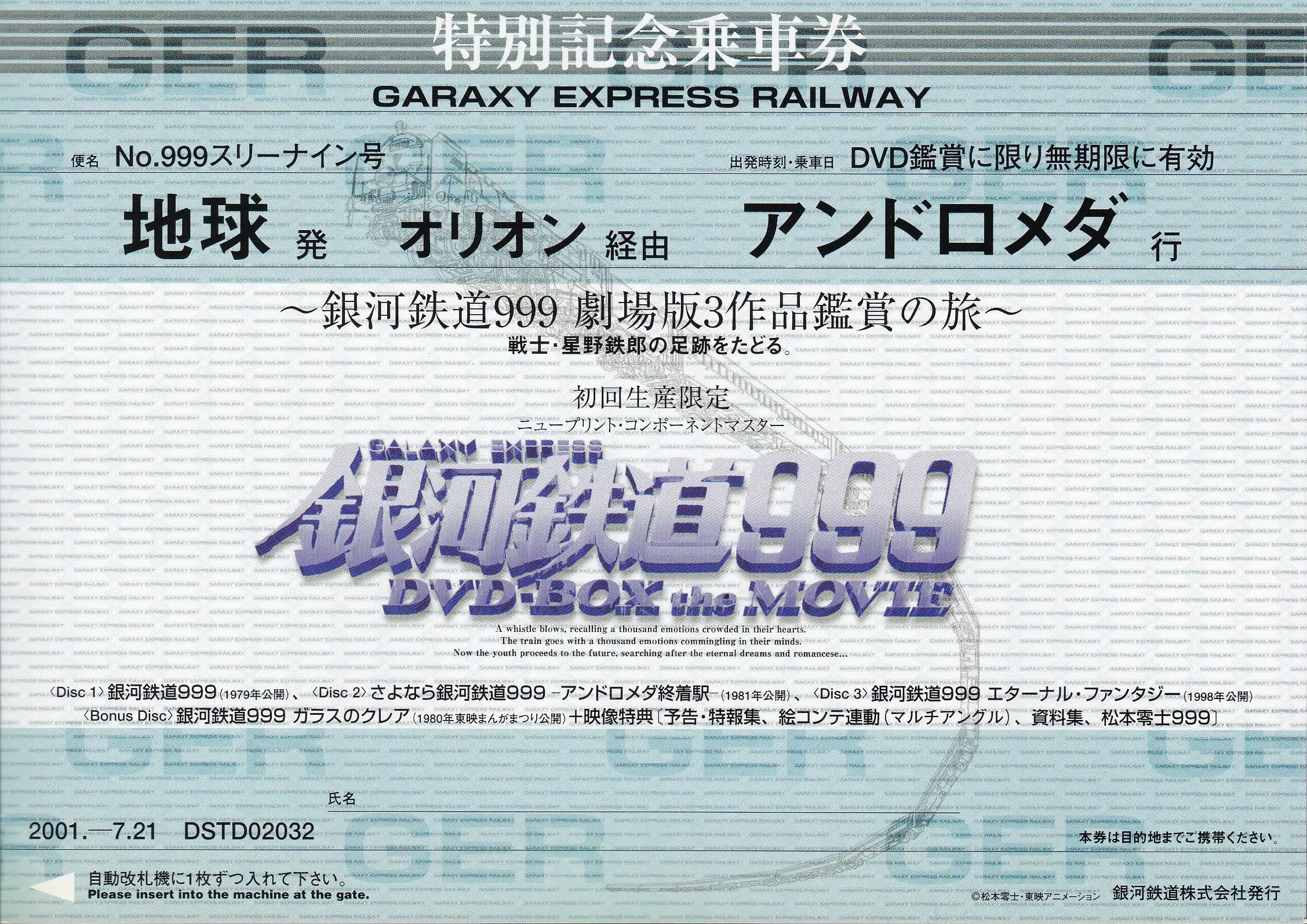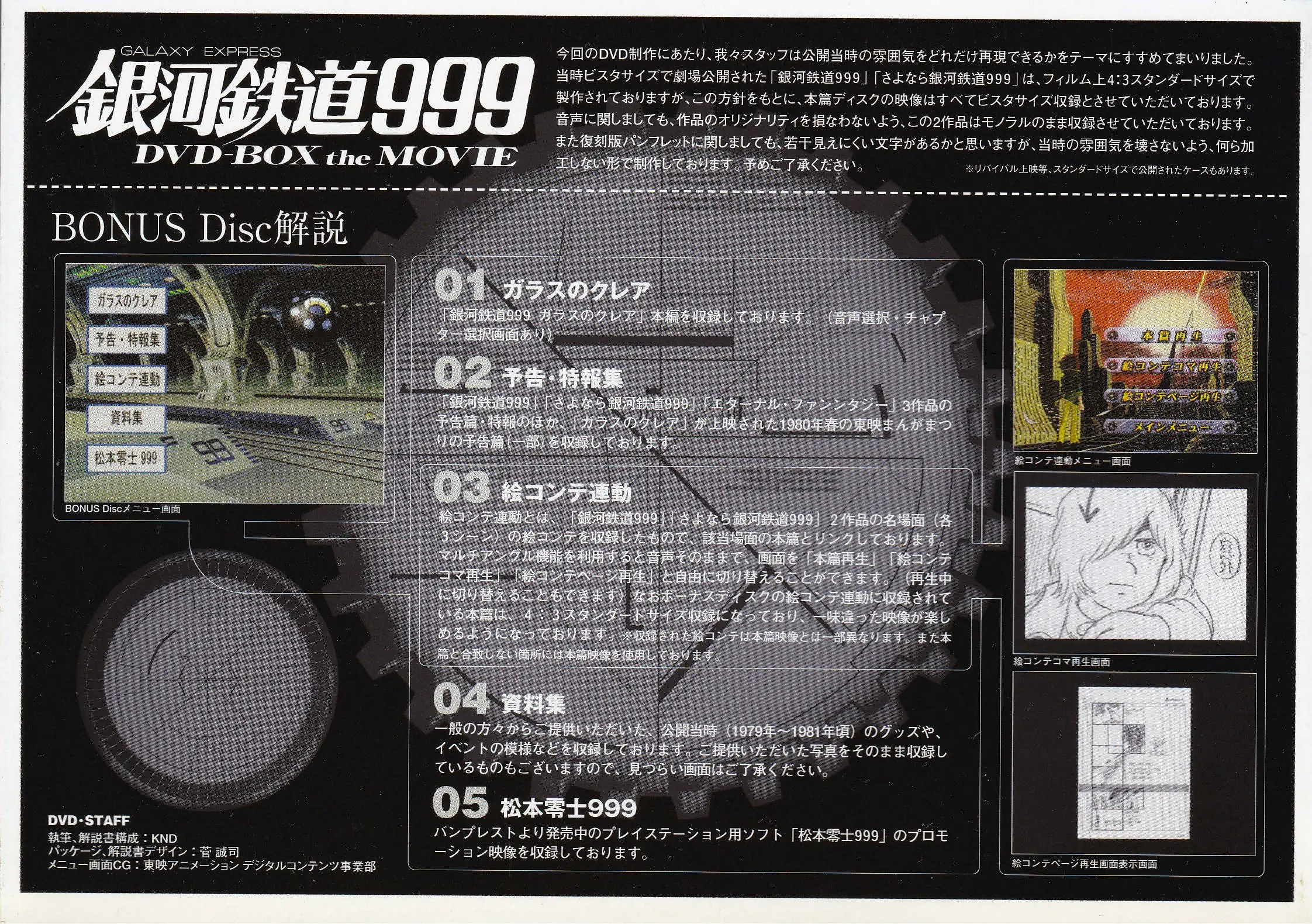 | 収録 | ・ ・さよなら銀河鉄道999-アンドロメダ終着駅- ・銀河鉄道999エターナル・ファンタジー ・銀河鉄道999 ガラスのクレア(1980(昭和55)年東映まんがまつりのプログラムの一本として上映された短編作品) |
