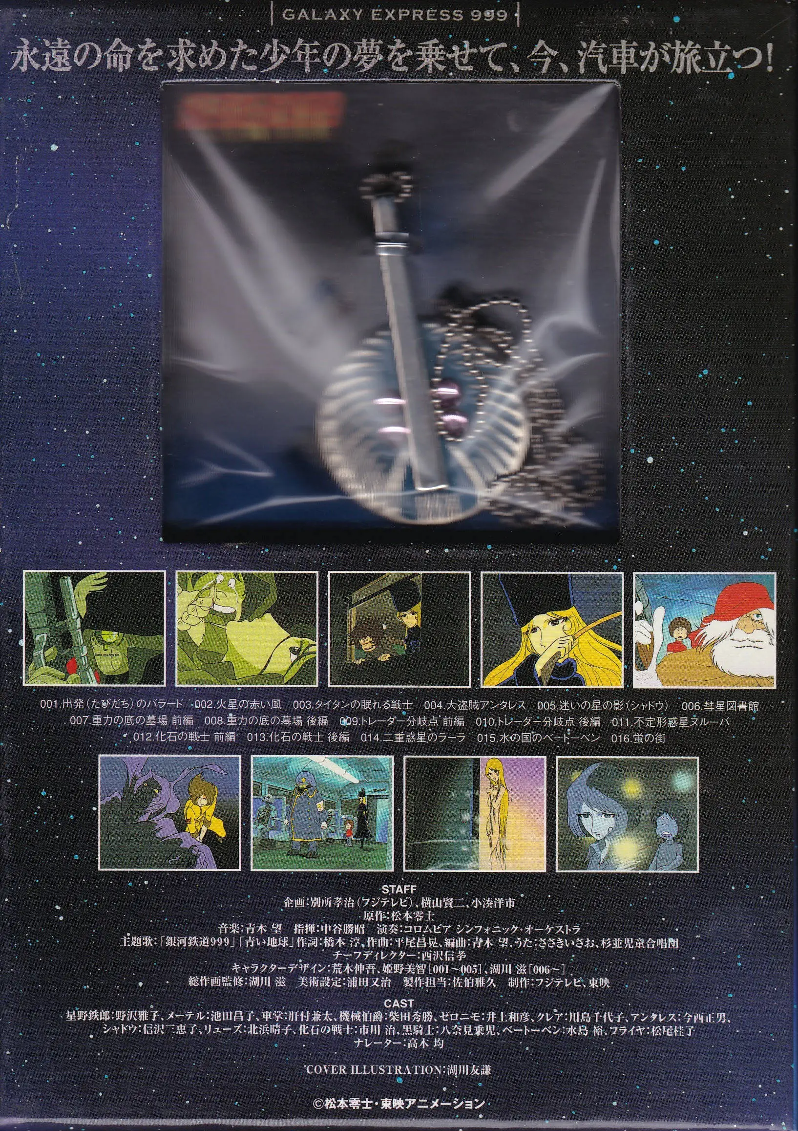 | 収録 | DISC-1 001 出発(たびだち)のバラード 002 火星の赤い風 003 タイタンの眠れる戦士 004 大盗賊アンタレス DISC-2 005 迷いの星の影(シャドウ) 006 彗星図書館 007 重力の底の墓場 前編 008 重力の底の墓場 後編 DISC-3 009 トレーダー分岐点 前編 010 トレーダー分岐点 後編 011 不定形惑星のヌルーバ 012 化石の戦士 前編 DISC-4 013 化石の戦士 後編 014 二重惑星のラーラ 015 水の国のベートーベン 016 螢の街 豪華解説書 原作者メッセージ付き原画イラストボード 「母の形見のペンダント」 |
