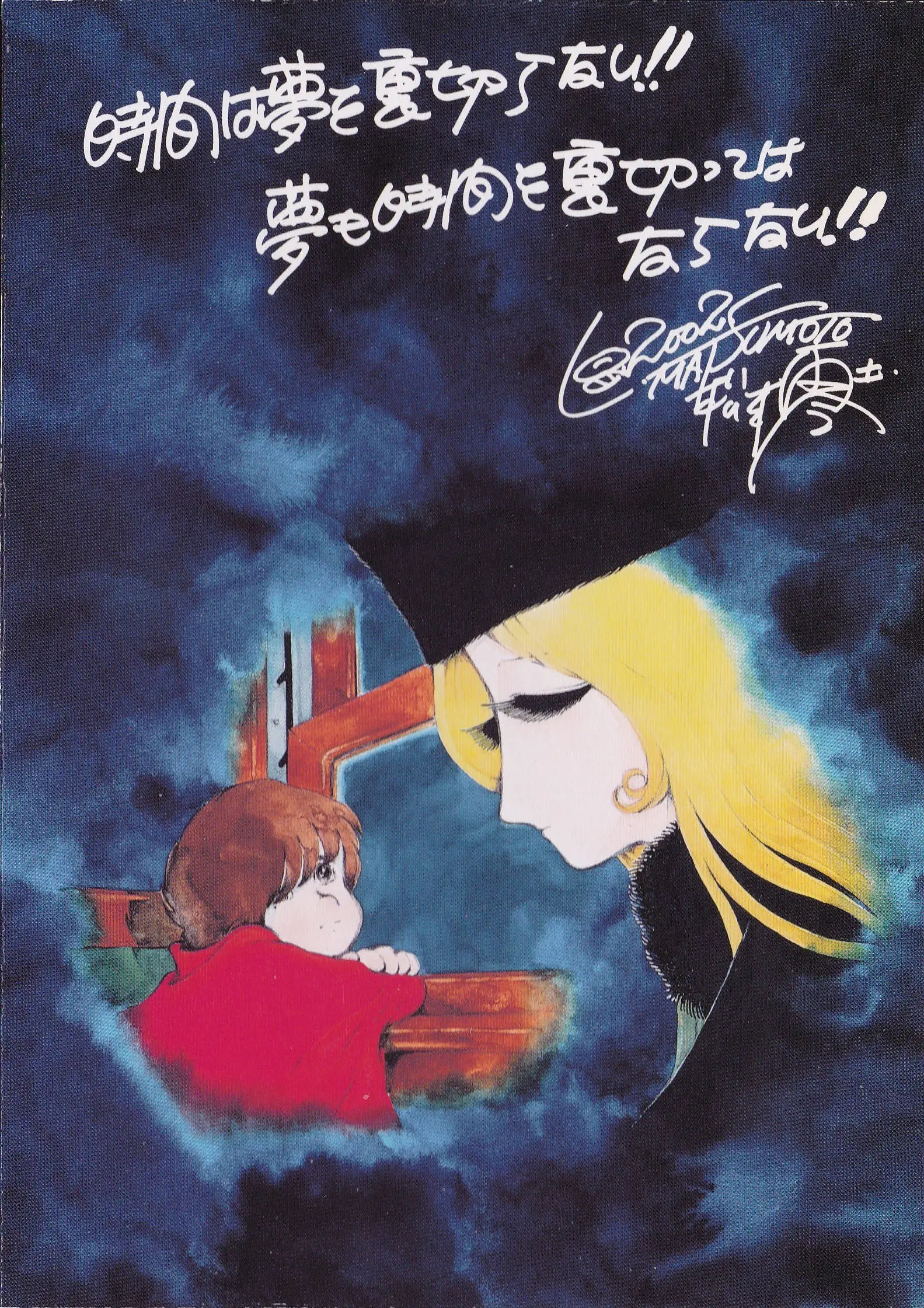 | 原作 | 旅立ち=自立、誰もが人生を旅する者たち----原作:松本零士 999というのは少年期という意味なんです。1000になると”さらば少年の日々よ”となり、青年に変わる。少年と青年はハッキリ違うんです。だから999というのは未完成という意味でもあるんです。 少年を主人公にしたのは、単純な話で自分が男だからです。少女、女性の気持ちは解らんですよ(笑)。そんな男が少女漫画を描いていたんだから。若い頃は悲惨な目に会ったわけです(笑)。精神的に同化出来ない、描くこと自体が不可能ですよ。女性というのは永遠にミステリアスな存在なんです・・・・・・今でも解らんですよ(笑)。だから夢をかけられるんですけどね。鉄郎は特に、自分自身であると言ってもいい存在です。私自身、動き回るのが好きでじっとしていられない。せっかくなら見なければ損だという好奇心が自分を支えているんです。だからやたらケガをたくさんするんですよ。私は骨折からなにから大抵のケガは経験していますから、それも描けますしね。痛みの伝わり方。そしてこれくらいではどうにかならんぞ!ということも解っている。精神的防御装置付きなんです(笑)。それと子供の頃から山を駆け回って散々暴れまくったからか、ダニ、蚤、蚊の類には一切食われない。適応能力が付いているんでしょうね。乗り物酔いもしない。どこででも寝られる。どんな状況でも食欲はなくならない。あと風呂嫌い(笑)。これ全部、鉄郎も同じですよ。 星々の中を旅する鉄道に乗った男だから、星野鉄郎。私も18歳の時に「2度と帰らん!」と、九州から東京に出て来たから。男はそういうものですよ。旅に出るというのは自立です。場所を移動するしないではなく、人生という旅に出るということです。 『銀河鉄道999』の鉄郎の旅は、大きく6つに分けられます。鉄郎が永遠の身体、永遠の命に憧れて地球を飛び出す。それまでの苦労、母との死別・・・・・・哀しさを抱えての旅立ち。というのが第一章です。 第二章では旅立った鉄郎が、ガラスのクレアや様々な人と出会い宇宙にも色々な事があるということに目覚めながら、自分自身の夢を果たそうとする。その中で、メーテルというのは一体何者なんだろうと、疑問を持ってくるんです。 第三章になると、鉄郎が宇宙で色々な経験を積んでいくわけです。自分は不幸な子供だと思っていたけれど、もっと悲惨な境遇をたくさん見て、自分なんかましな方だと思うわけですよ。何よりも自分には気力や夢がある。メーテルという、幻かもしれないけれど・・・・・・いっしょに旅をしてくれる女性もいると。 命の長さ、本当の夢を考えるようになってくると第四章。 第五章では、永遠に生きる事だけが幸せではないと初めて気づく。時間の長短というのは宇宙の尺度に置き換えると変わらなく同じであると。大事なのはその瞬間に何をしたのか?ということに目覚めていく。ならば機械の身体なんかいらないのではないか。 機械の無限な命なんかいらないと、最終章では完全に思う。しかも人を犠牲にしてまで長生きするような存在なんか許さないと目覚める。TVシリーズになっている『999』は、鉄郎が機械の身体、永遠の命を否定するところまで行っているんです。 次は鉄郎と旅する女性、メーテルについてお話ししましょうか。 |
